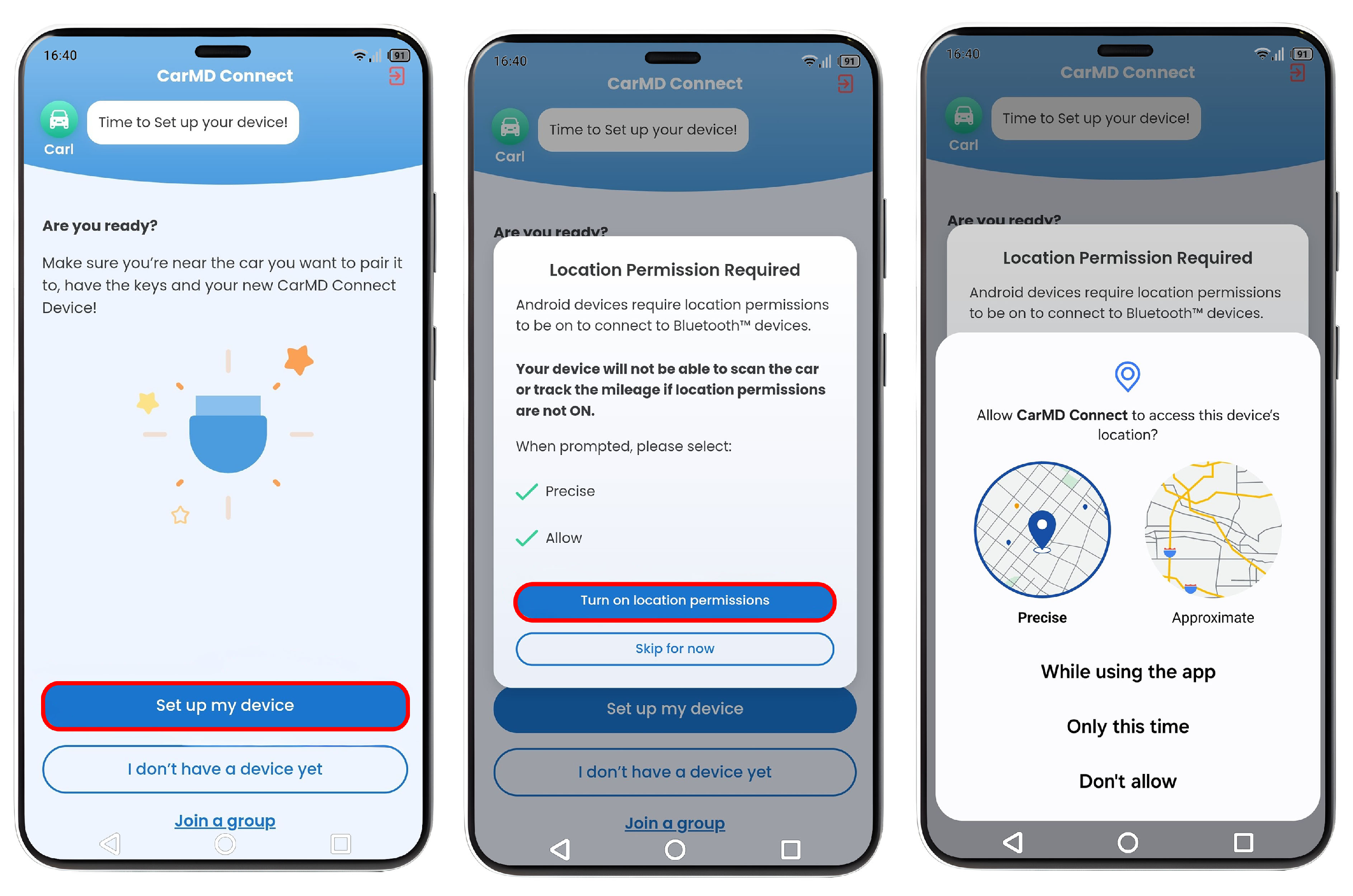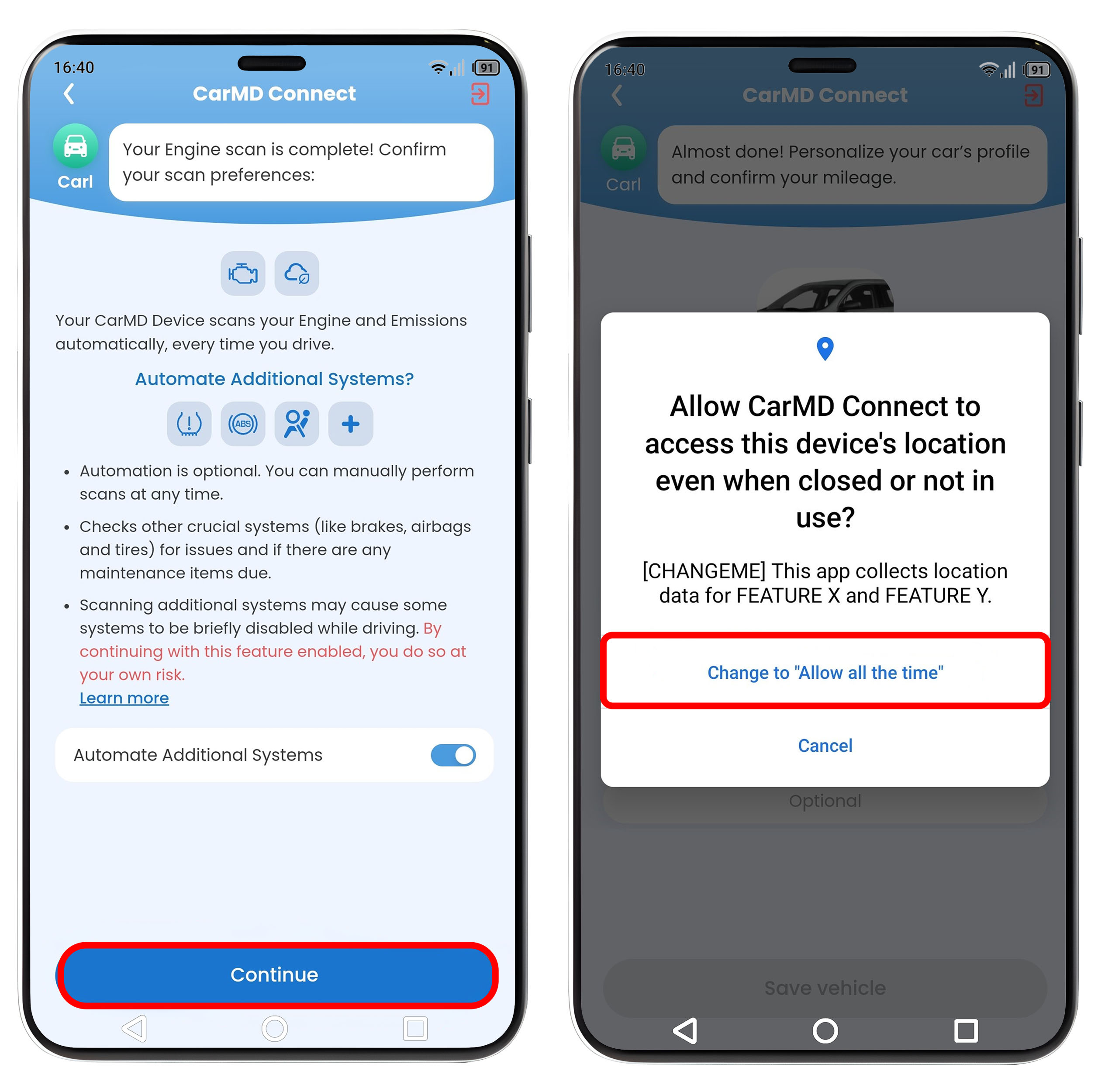 - Make sure to allow the location permissions to be able to connect to Bluetooth. Your device will not be able to scan the car or track the mileage if location permissions are not ON.