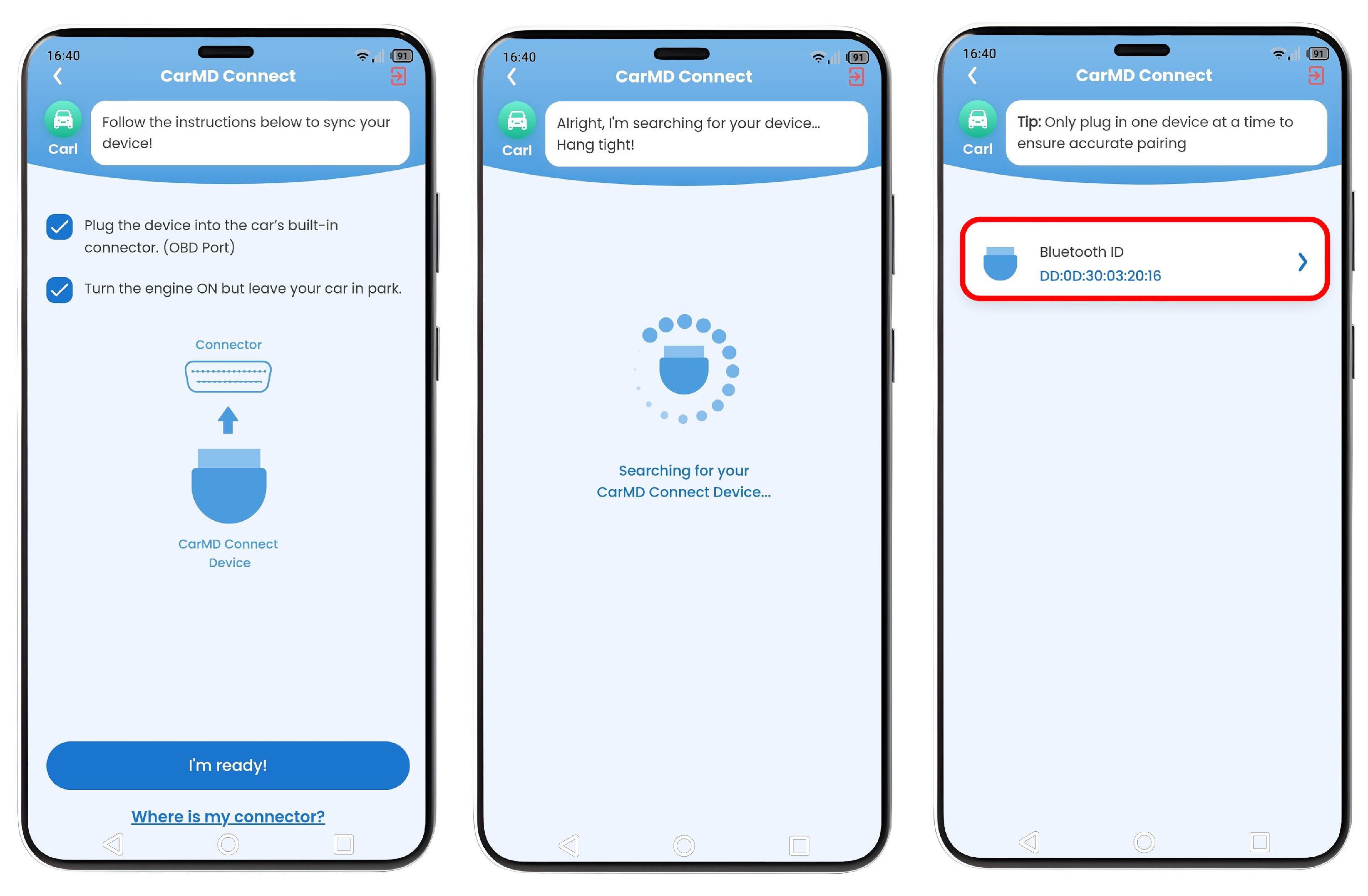 - Start your engine, wait a few seconds, and proceed to pair your CarMD Connect device.