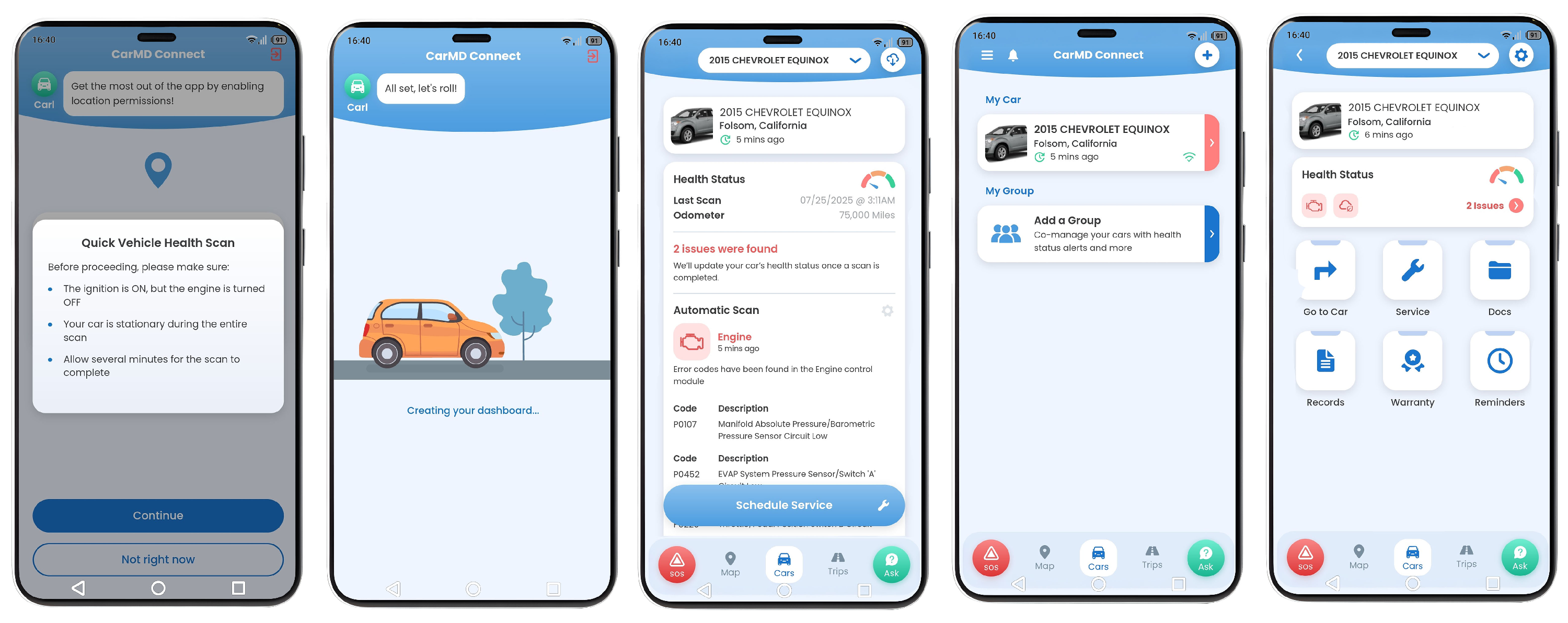- While at your vehicle, open the CarMD Connect app and follow the prompts. Make sure your Bluetooth® is enabled on your smartphone.