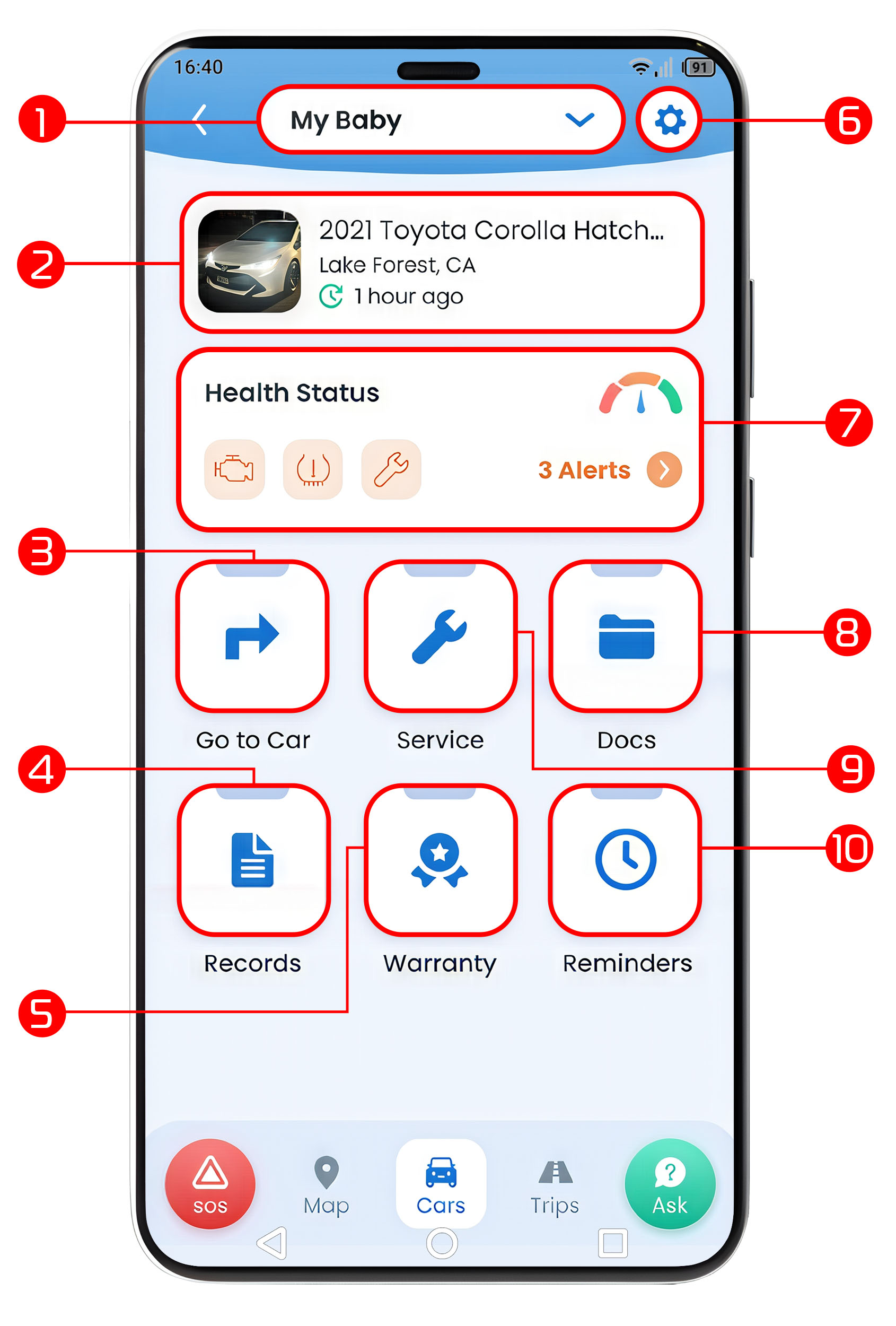 - Vehicle Settings: Allows customization of vehicle photo, nickname, annual mileage, and other settings. Device pairing is also controlled with this button.