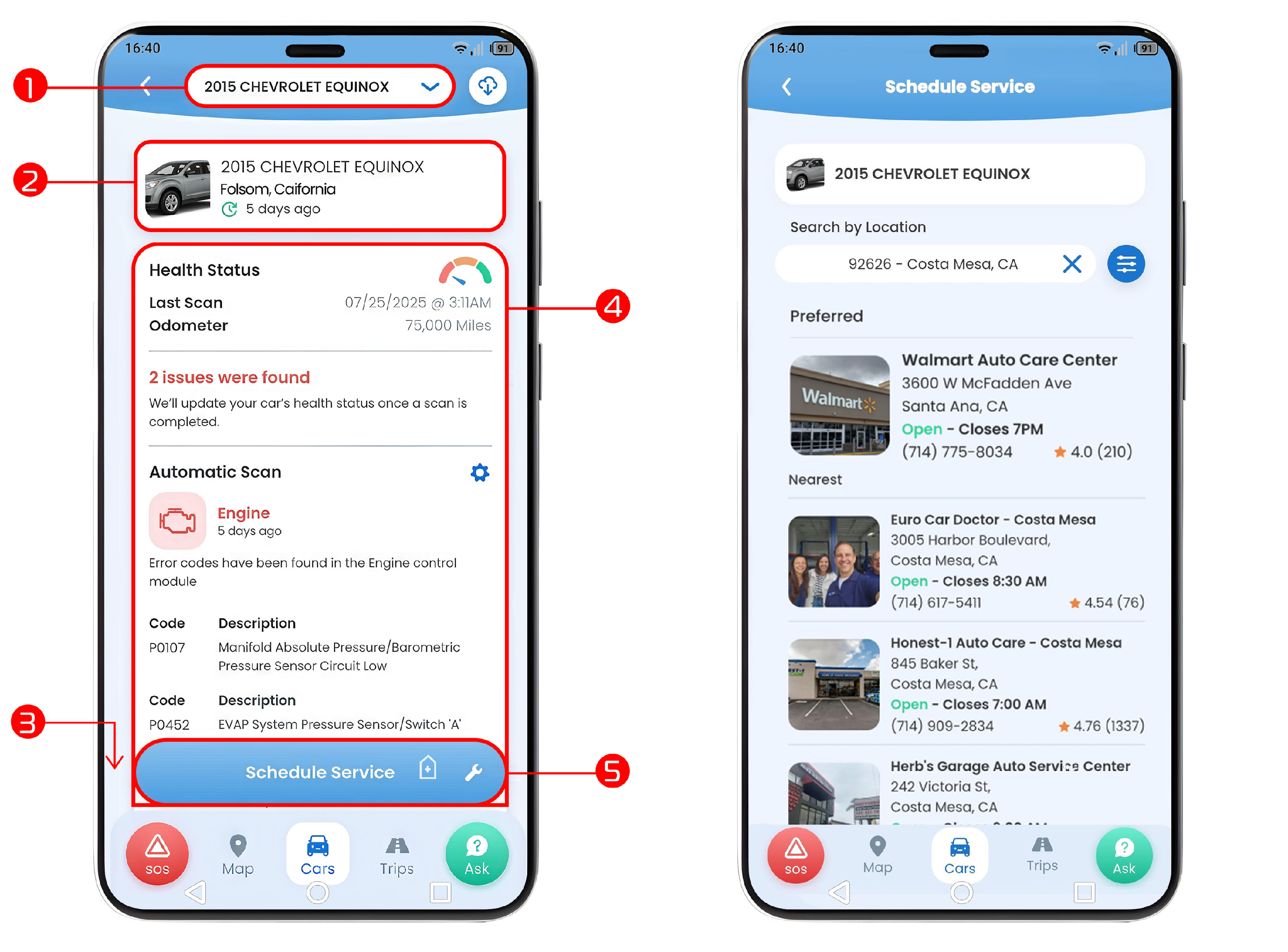 - Schedule Service: Opens page to search, select, and contact preferred shop to schedule a service appointment. Note: Walmart Auto Care Center locations are only shown if the vehicle has one of the following conditions: Battery Voltage light, Oil Level Light, Oil Life Light, TPMS Light, and Maintenance Light. Available shop locations are also dependent on the user's service location.
